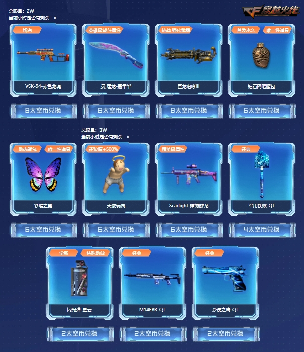 无意兑换源英雄级武器或太空币充足的CFer还可以选择兑换其他奖池内武器道具,稀有武器VSK-94赤血龙魂以及经验值高额加成道具天使玩偶也将在本次活动中限量放送,还有全新特殊动效投掷武器闪光弹-星云不容错过。