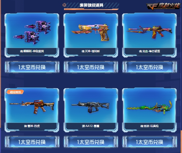 在兑换奖池内,CFer每天都将可以选择2件道具收入囊中,包括魂麒麟刺-神秘黑洞、御雷神烈虎、源AA12-雷霆在内的6件源英雄级武器仅需1枚太空币即可兑换。
