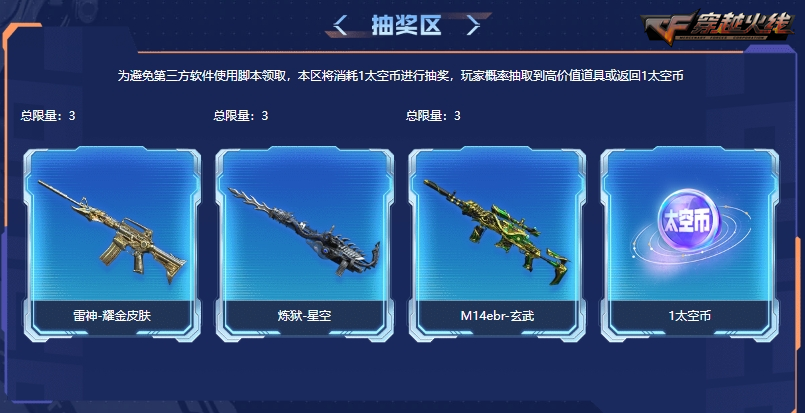 4月4日至6日期间,CFer每日登录游戏后还可以进入活动页面领取2枚太空币用于兑换或抽取强力武器道具,后续每日登录或每周登录掌火也可以领取1枚太空币,有机会抽取获得雷神-耀金皮肤、炼狱-星空或M14EBR-玄武,并且未成功抽取获得道具也将获得1枚太空币的返还。