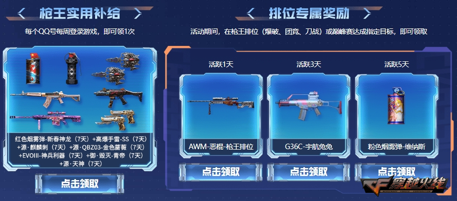 除以上活动之外,CFer在4月11日前参与枪王排位对战或巅峰赛季前赛玩法达成指定条件还有专属奖励相赠,每周登录游戏也可以领取枪王实用补给,4月11日成功获得游戏内巅峰赛第一名的CFer更有专属名片喷图相赠!