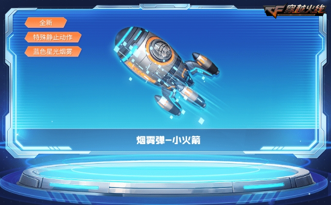 本次活动还将有全新烟雾弹“小火箭”限时免费放送,活动期间,CFer建立或加入团队达到5人,其中至少3人游戏过1局且CFer本人至少游戏过1局即可领取永久版本的该武器,趣味火箭外观搭配特殊静止动作及蓝色星光喷雾,陪伴各位CFer穿梭时空进行更多挑战。