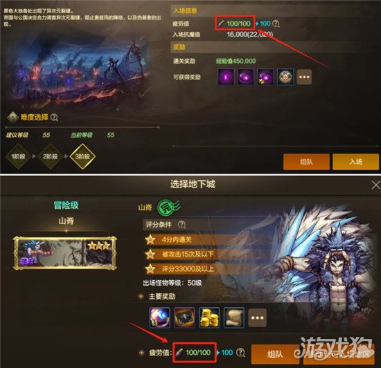 除了搬炉岩炭对角色进行强化养成,勇士们还可以刷黑色大地获取封印石/精髓的制作材料以及祝福材料。这里就涉及角色疲劳值的分配使用了:
