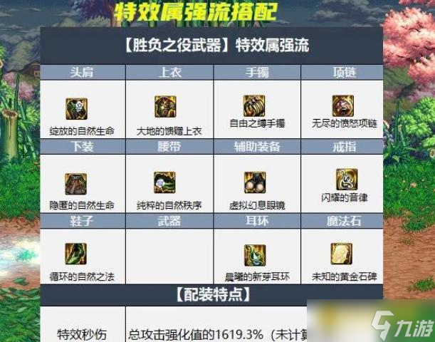 这套特效流搭配,总攻击强化数值1619.3%,未计算手镯。之所以选择“晨曦的新芽耳环”,是为了更好的达到250属强门槛。当戒指在属强达到250门槛后,可换自定义史诗,或者绽放的神秘之花。
