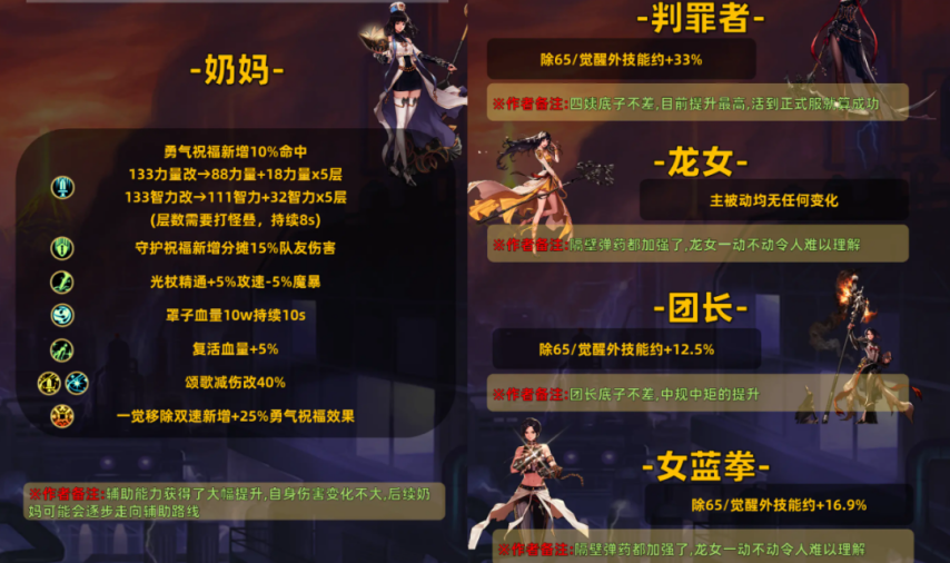 【6】女圣职者“奶妈”辅助能力得到了巨大提升,新增了命中和为队友分摊伤害,以后就是标准的辅助流代表了;“四姨”加强33%,体验服数据提升最大的一个职业;“龙女”原地踏步,“团长”加强12.5%,“女蓝拳”增加16.9%!