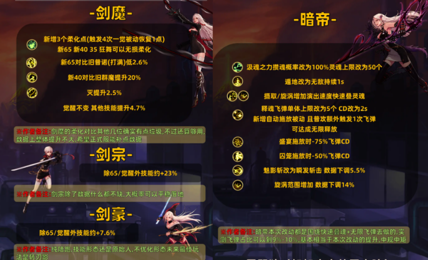 【2】女鬼剑士“剑魔”新增加了优化点和新技能,实战体验大幅度提升;“剑宗”加强23%,和修罗哥属于同一个水平,也是未来的香馍馍。“剑豪”加强7.6%,可以和鬼泣哥坐一桌了。