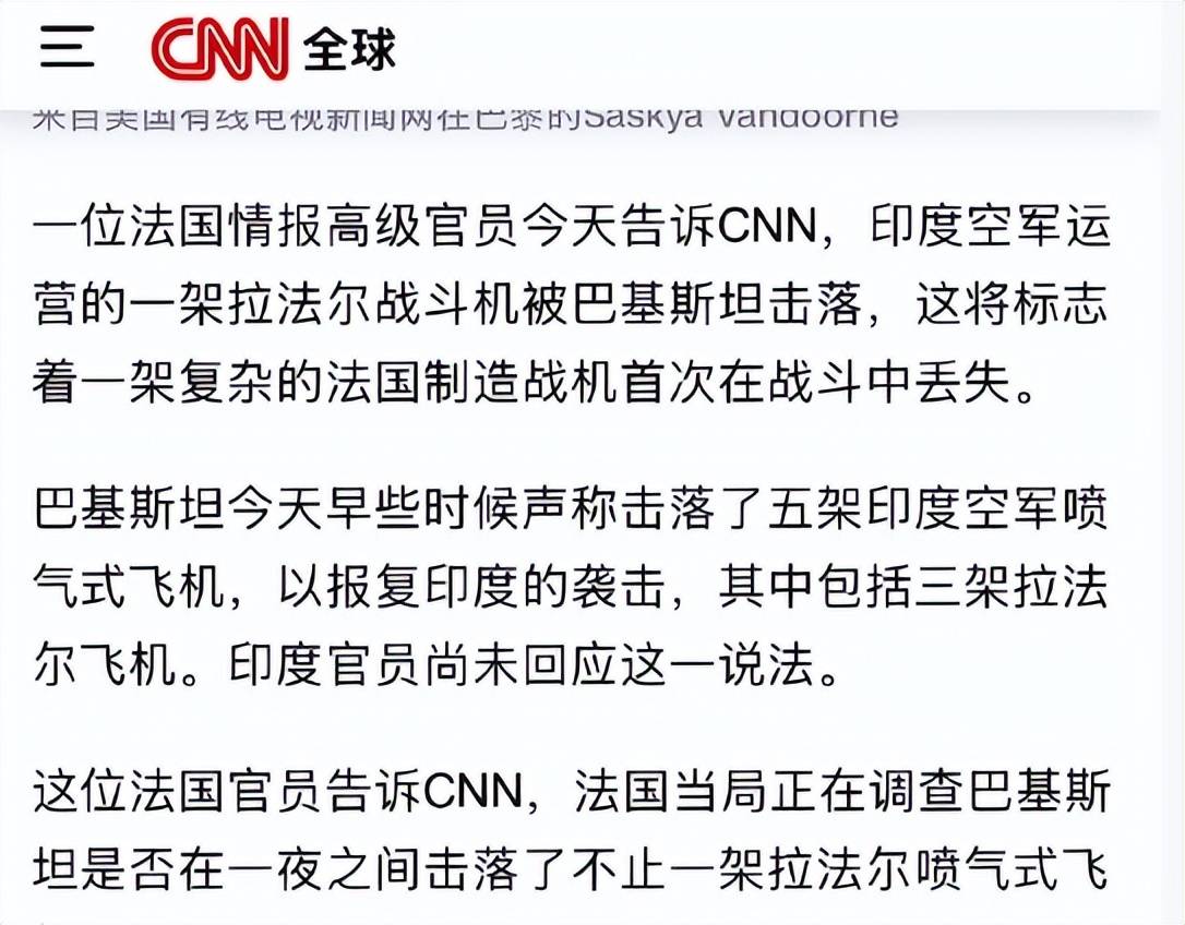 目前已经有法国情报官员在接受CNN采访时透露,已经确认了一架印军的阵风战机被击落,目前法国正在调查印军是否在一夜之间被巴基斯坦击落了多架阵风战机。