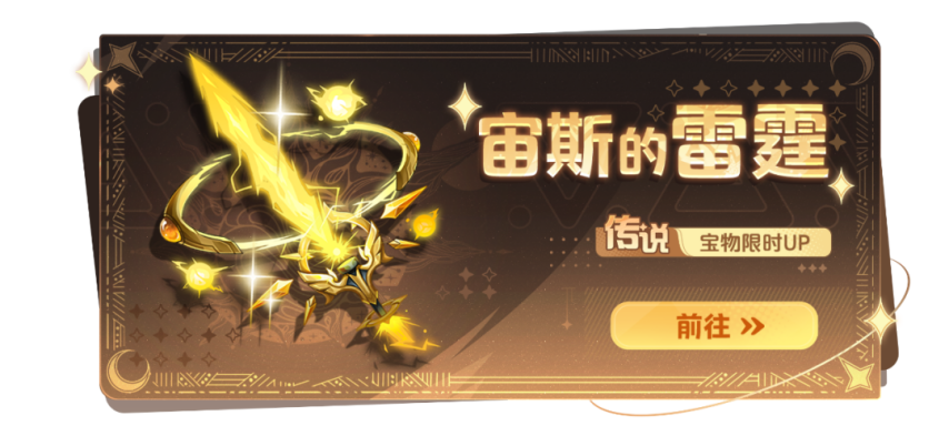 活动期间,在限定夺宝活动中使用【命运号角】召唤传说宝物,将必定获得传说品质神器【宙斯的雷霆】系列宝物!