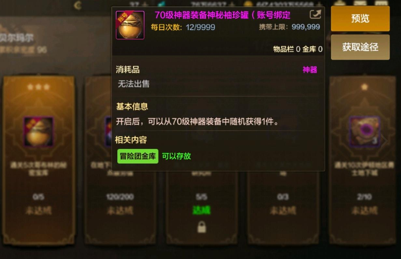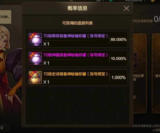 当然了,如果大家同时开出了史诗罐子和这个神器罐子的奖励,那么一般玩家最好还是选择神器罐子,毕竟这是百分百开出神器的。而史诗罐子只有1%的几率开出史诗装备,开出紫装的几率高达89%,一般玩家可没有这么好的运气。