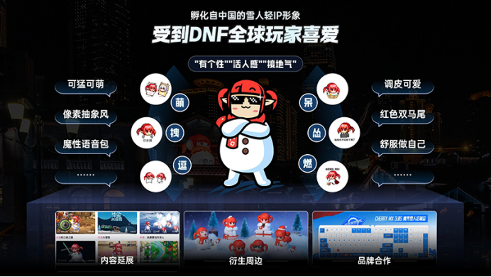 另外,在文化融合的过程中,DNF中国团队很敏锐地注意到,身穿“雪人”套装的魔道学者职业形象在中国玩家的社区传播当中被广泛使用,并创造出了大量优秀的表情包、绘画以及视频作品,于是顺应了中国玩家这一喜好,后续不仅在游戏内围绕这一形象打造了更多内容,而且在游戏外也推出了相关衍生周边,并以此形象来对外开展了一系列品牌合作。