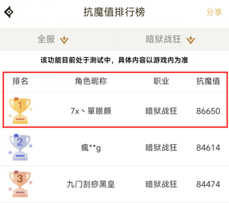 最近有玩家发现狂战士的全服抗魔值排行榜的第一名有变化,这次登顶的第一名玩家的ID有点陌生啊,这个名字大家也是第一次见到。但可以看到的是这名玩家的抗魔值竟然高达86650,这比第二名都高出了足足2000多点抗魔值啊。这种情况可是很少见的,要知道以往这抗魔值排行榜每一位基本都只相差几百点抗魔值而已。这一次第一名高了第二名这么多抗魔值,这次真的是断档第一了啊。难道说这游戏又出现了超级土豪嘛,不然怎么会有这么离谱的抗魔值,这怕是得全身增幅13以上才行吧。