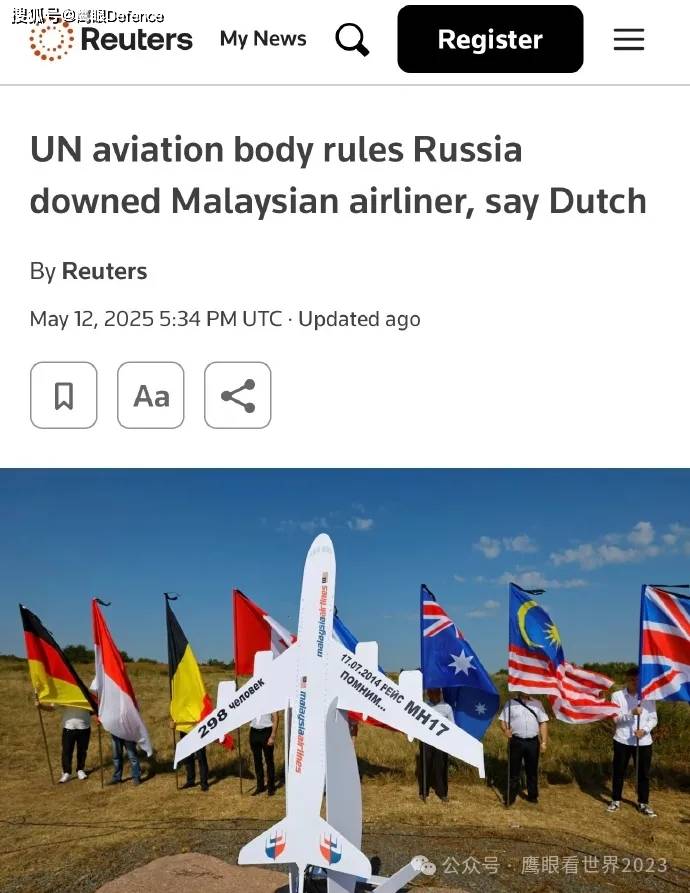 据路透社报道,在荷兰和澳大利亚申诉并得到荷兰外交部确认后,联合国航空理事会于5月12日裁定,2014年7月17日在乌克兰上空发生的马来西亚航空MH17航班被击落事件应该由俄罗斯政府负责,此举违反了《芝加哥国际民用航空公约》。