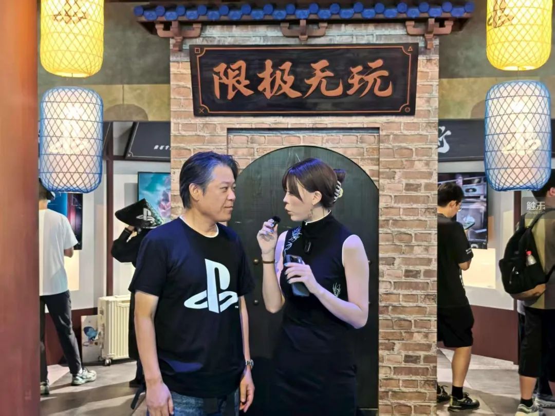 N1场馆的2号入口处就是PlayStation展台,今年的PS展台一改往常的蓝白配色,建起了飞檐斗拱的东方楼阁,这与这里提供试玩的《黑神话:悟空》《影之刃零》和《失落之魂》等国产游戏的调性一致,展台的一侧排起了当天最长的游戏试玩队伍。在第一天的CJ现场,我们和索尼互动娱乐(上海)董事长兼总裁江口达雄聊了几句,那时的他正站在“玩无极限”的牌匾下被众人环绕。