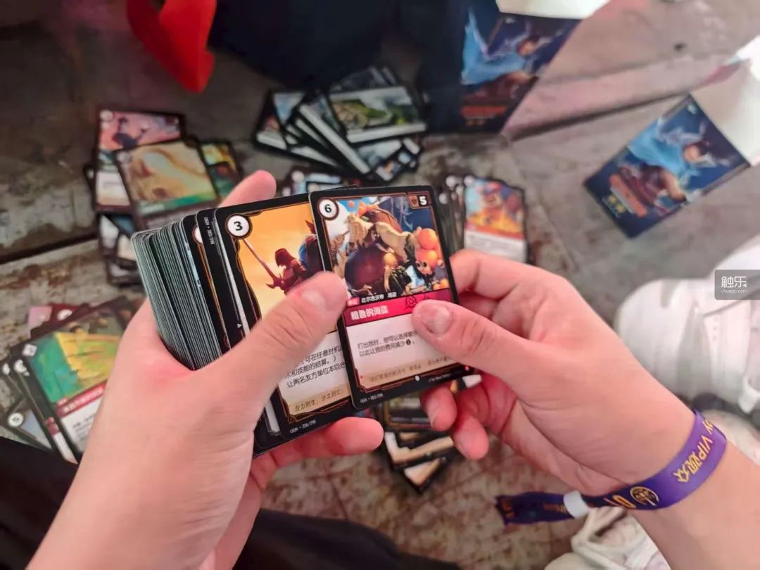 N4场馆基于“英雄联盟”IP打造的TCG卡游《符文战场》展区附近聚集着不少“牌佬”,《符文战场》也在本次CJ上正式宣布在中国地区发售,官方在现场设置了购买摊位,玩家的队伍排得很长。一位玩家看起来已经结束了这次购买,他坐在地上,旁边杂乱地堆着背包,正在摆弄着手里的卡牌。