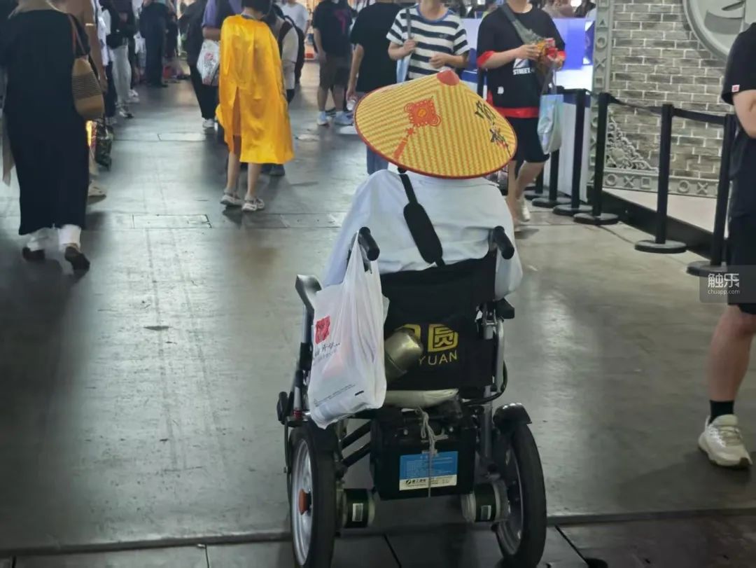 8月4日星期一,也是ChinaJoy的最后一天上午,我们依然来到了场馆。当天N1馆出现了一位坐着电动轮椅的大爷,他头顶一个黄色斗笠,与一旁PS展台工作人员们戴的《影之刃零》黑色斗笠交错在一起,看起来意外和谐。大爷的轮椅把手上用支架固定着一部手机,始终停留在拍摄界面。每当大爷想要拍摄时,他会先把轮椅调整到合适的方向,再点击录像键,移动轮椅运镜。我们在大爷身后跟了许久,直到他拍尽兴,驾驶轮椅到场馆一旁休息时,我们凑上前,把今天收到的所有周边都塞进了大爷的帆布包里。