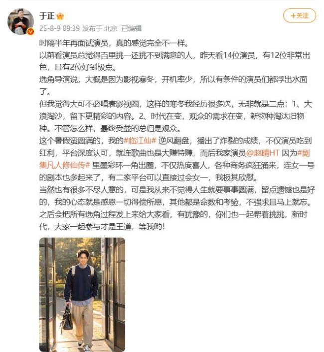 于正表示,时隔半年再次面试演员时,感觉与之前大不相同。以前总觉得百里挑一都难以找到满意的演员,但这次面试了14位演员,其中有12位表现非常出色,还有两位更是令人印象深刻。选角导演认为这可能是因为影视行业寒冬导致开机率降低,使得更多有实力的演员浮出水面。
