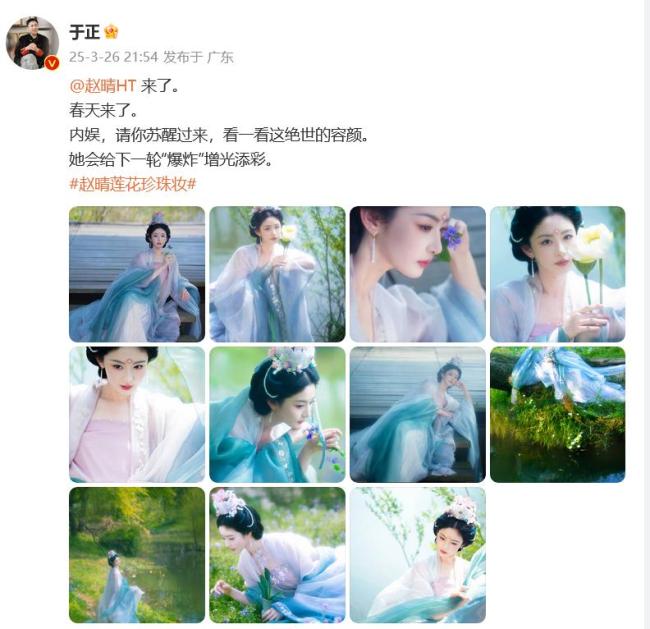 此前3月26日,于正曾晒出一组赵晴的精美写真照,并称赞她的美貌,称其为“绝世容颜”,引发了不少关注。公开资料显示,赵晴出生于2000年,来自黑龙江,毕业于浙江传媒学院,目前签约欢娱影视。她之前是汉服圈网红,网名为“全麦小核桃”,并被认为与赵丽颖有几分相似。