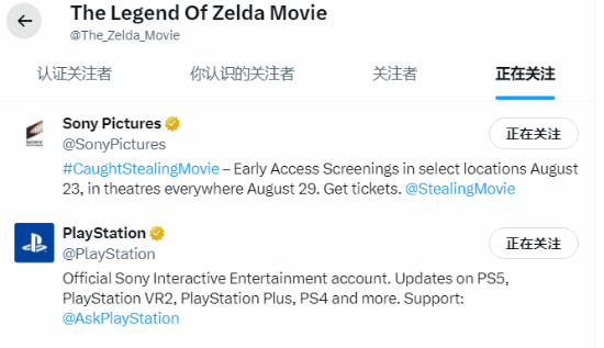 目前,这个账号只关注了两个对象——电影的联合出资及发行方索尼影业,以及索尼游戏部门PlayStation。而它并未关注《塞尔达传说》的原创方、游戏平台任天堂,这让不少粉丝觉得颇为微妙。