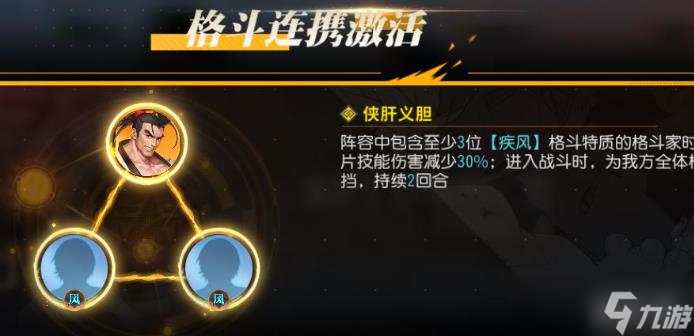 最后羁绊的类型有很多有关于属性的和职业的,例如侠肝义胆的效果就是三个风阵营的角色可以触发三成伤害减免和加上一成的格挡效果可以说是异常的强大了。