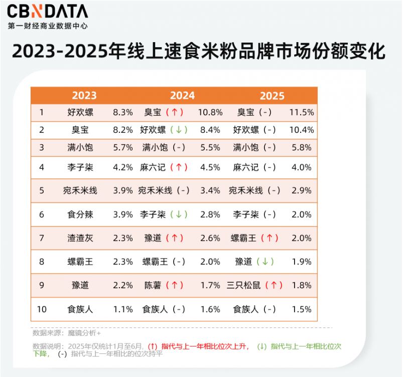 微念集团合作运营了包括速食品牌臭宝、李子柒,和专注米粉米线供应链服务的品牌兴农微念,为线下粉类终端提供大宗原材料供给。“品牌化”早已成为关键命题,魔镜数据显示,臭宝连续两年蝉联线上速食米粉市场份额首位,且市场份额增速领先,从2023年的8.2%攀升至2025年的11.5%,是当之无愧的螺蛳粉市场第一品牌。除此之外,微念集团和李子柒品牌连续三年(2021-2023)全国螺蛳粉销售额第一。