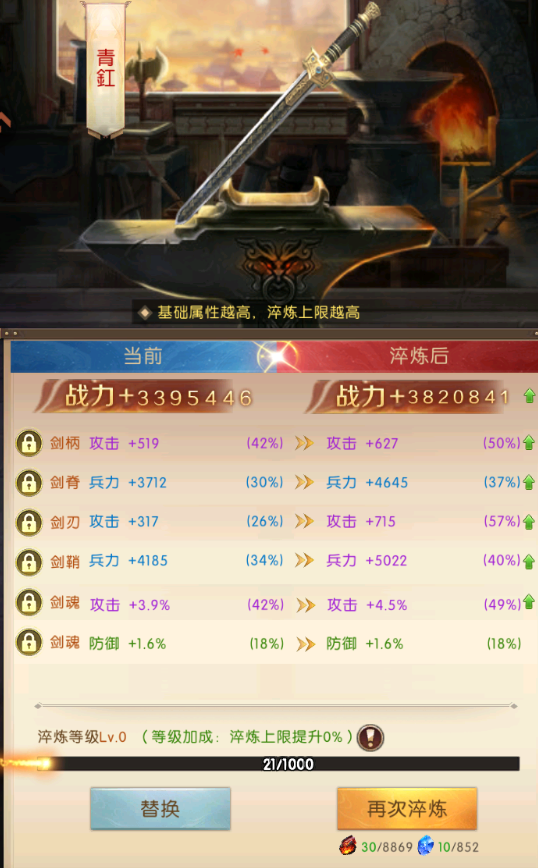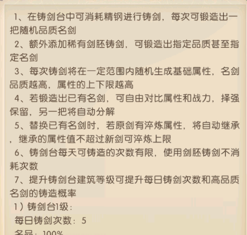 每次铸剑可随机获得一把品质的名剑,每把名剑都附带随机的基础属性可提高主公的战力,品质越高的名剑的上限就越高,主公也可通过淬炼名剑去提升属性,若锻造出已有名剑,可自由对比属性和战力,择强保留,另一把将自动分解,替换已有名剑时,若原剑有淬炼属性,将自动继承,继承的属性值不超过新剑可淬炼上限。