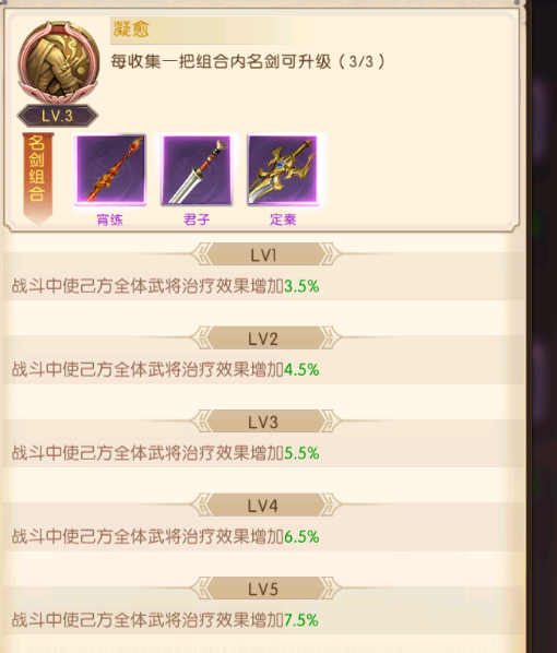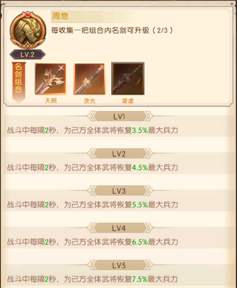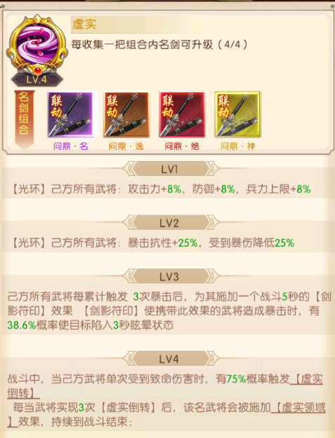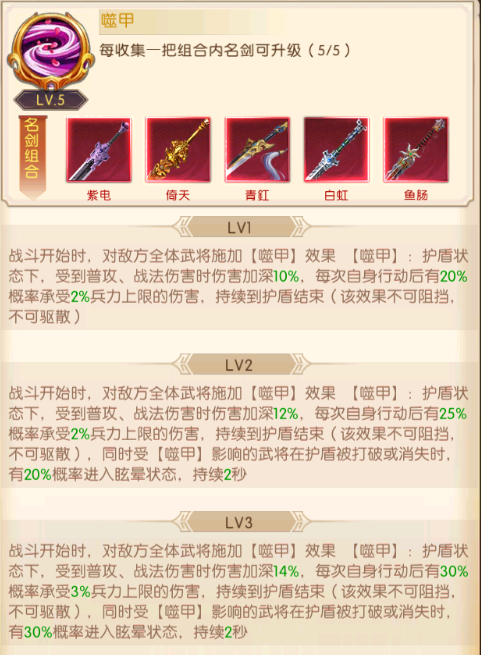 每个品质的名剑都会有配套的组合技,当主公集齐了对应的名剑,就会激活名剑技的效果,品质越高的名剑技效果就越强大,并且名剑技的技能等级会随名剑的收集度提升。