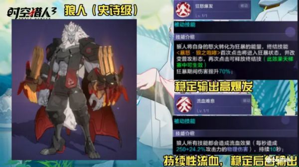 狼人的特点主要就是:持续性的流血使得他即使后台也能提供不低的输出,以及高频的攻击且攻击的范围也较大,使得其输出手感可以说是目前角色中最好的,再配合其高倍率的技能使得狼人成为目前游戏最强角色。