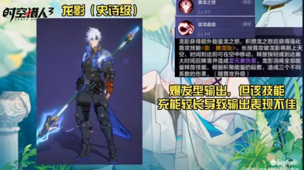 而龙影作为枪类角色,其充能完成后的爆发技能是其特色,而平时的技能释放也基本能满足其输出,可以说是一个基本不用普攻的角色,但奈何技能的伤害倍率不算高,所以总体输出也只有充能满后那一下比较亮眼,总的来说就是一个技能帅但是综合输出还行的角色。