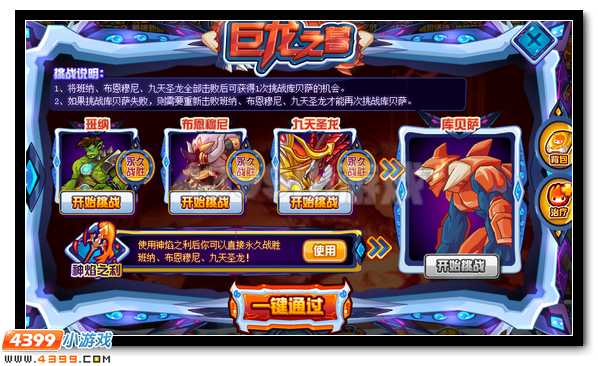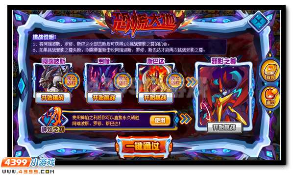 四个关卡的挑战BOSS打法由4399映月提供。下面就让我们一个个来看看吧!哈迪斯打法,首发神王宙斯众神祝福,之后万人敌张飞的万夫不当,然后用一个有先手固伤精灵补刀。