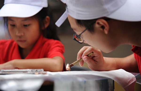 7月10日,在贵州省黔东南苗族侗族自治州丹寨县万达小镇,来自深圳的学生在体验苗族蜡染的画蜡技艺。贵州丹寨县的苗族蜡染技艺在2006年入选第一批国家级非物质文化遗产名录。每年暑期都有众多的国内学生非遗体验团前来体验苗族蜡染的乐趣,亲身感受非物质文化遗产的魅力。