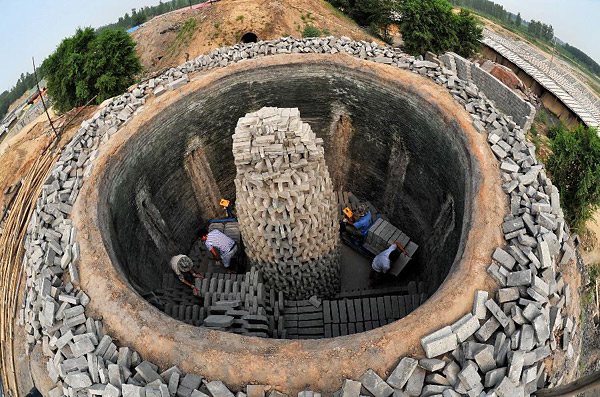 7月10日,任丘市出岸镇古建砖厂工人将烧制好的青砖出窑。河北省任丘市出岸镇古建砖厂,有一座始建于清朝道光年间的古砖窑,于20世纪80年代恢复生产。这家位于小村落里的烧砖作坊,用传统手工技艺制作青砖,每一块青砖都要经过取土、晾晒、制坯、装窑、烧制、出窑等工序,成品青砖先后用于北京故宫博物院、天坛、颐和园等古建筑修缮工程。2012年,古建青砖制作技艺入选河北省省级非物质文化遗产名录。