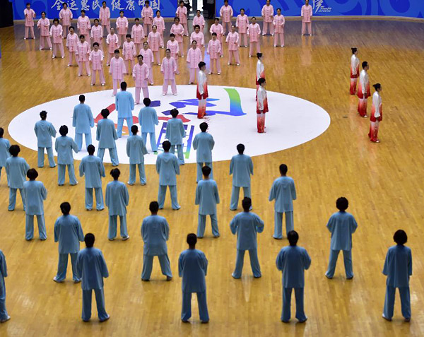 7月10日,第十三届全运会群众项目比赛健身气功决赛在天津继续举行。内蒙古自治区代表队在六字诀集体赛中以9.20分夺冠。而在备受关注的气舞决赛中,湖北队凭借《高山流水》夺得金牌。图为市民在开幕式上进行健身气功表演。